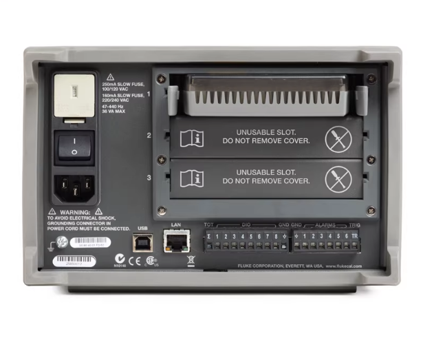 2638A后面板有三个插槽。每个插槽由一个可更换的继电器板和一个可插拔的输入接线盒组成。每台主机可以有三种配置选择-22/44/66通道。如果经费有限,可先选择22通道型号,以后再逐步扩展通道,以配合预算的需求。