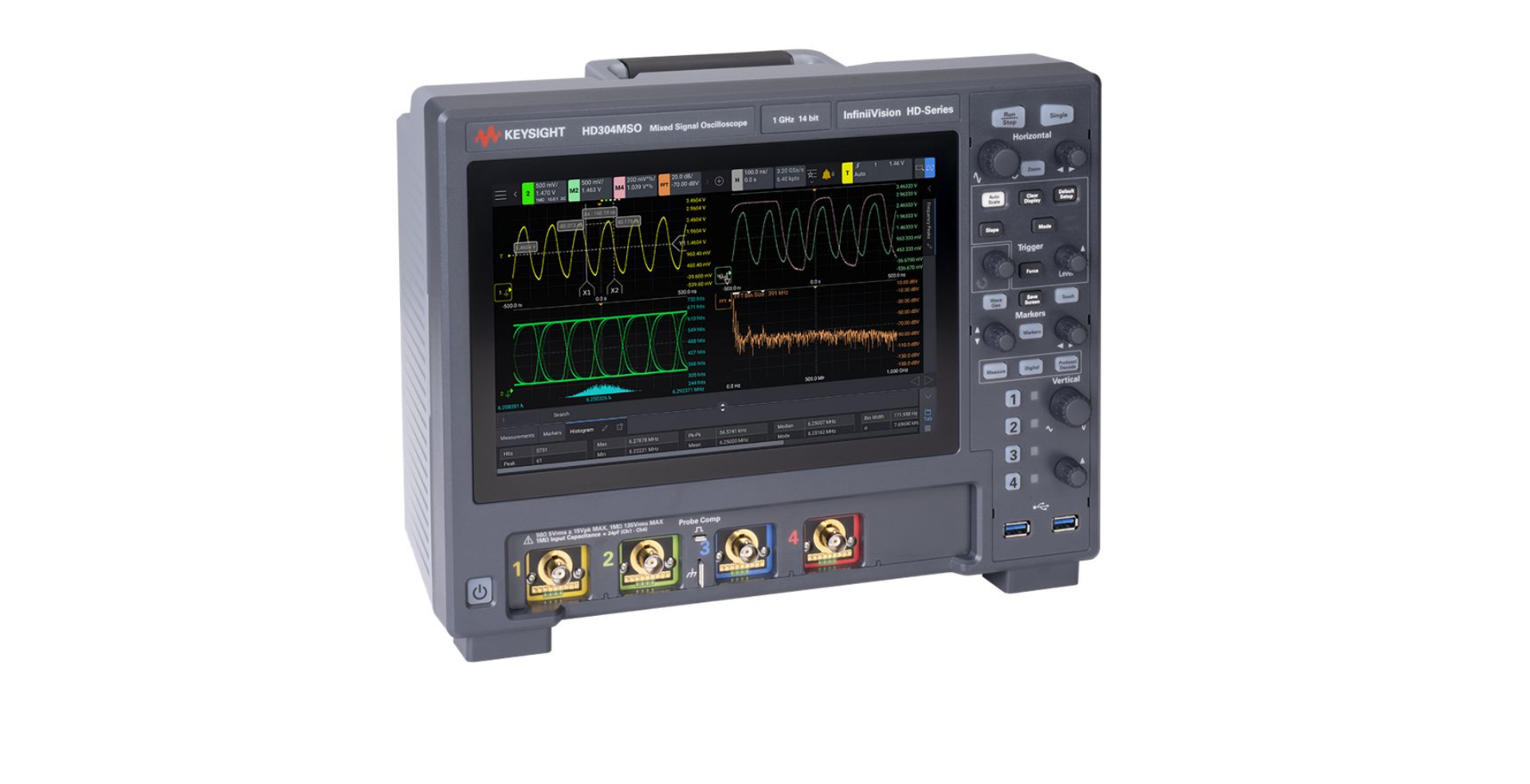 HD302MSO 示波器提供 14 位 ADC、2 个模拟通道、100 Mpts 存储器、1,300,000 wfms/s 更新速率和 10.1 英寸电容式触摸屏。