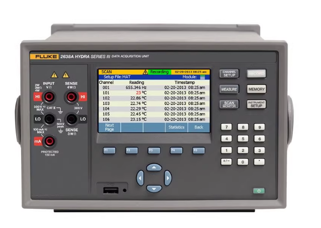 由于2638A集成了福禄克的通用输入接线盒,使得热电偶测量的准确度比大多数同级别的仪器更好。这个通用输入接线盒支持15种常用类型热电偶。温度功能的菜单选择使得2638A特别适用于温度校验的应用。在开始温度的测量和校验工作之前,如果您需要对多支热电偶的温度“归零”到一个已知参考温度,例如,将冷端温度补偿归一,您只需按一个按键把参考通道的读数作为偏置值保存到可支持的数据文件中,之后就可以把其他通道的数据对齐到参考通道。如果您要测试烘箱,或是依照AMS准则测试加热装置,又或是依照21CFR规范校验温度设备,2638A都可以帮助您轻松应对并符合规范的要求。