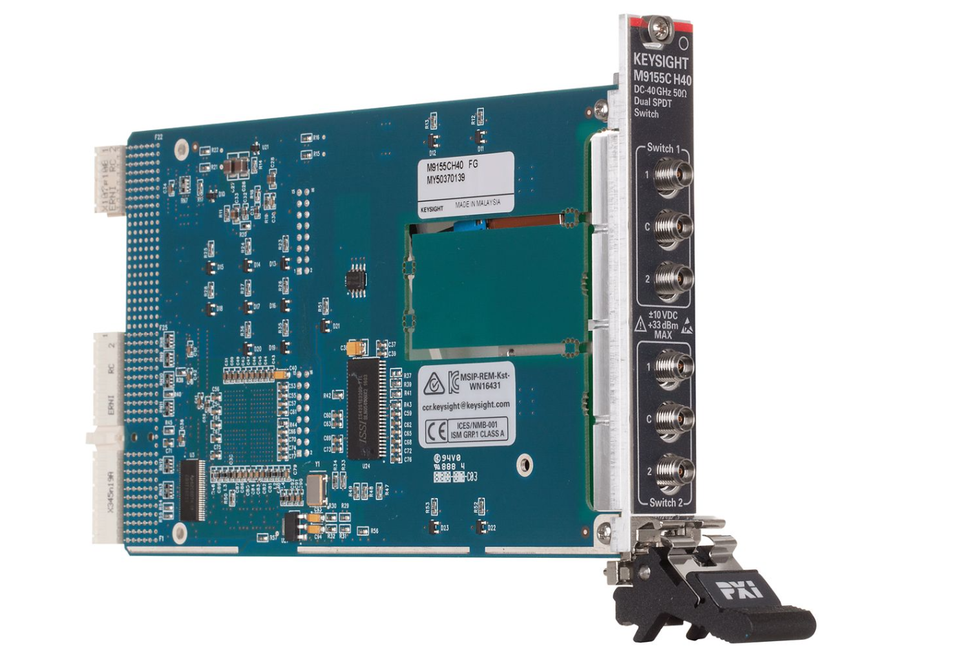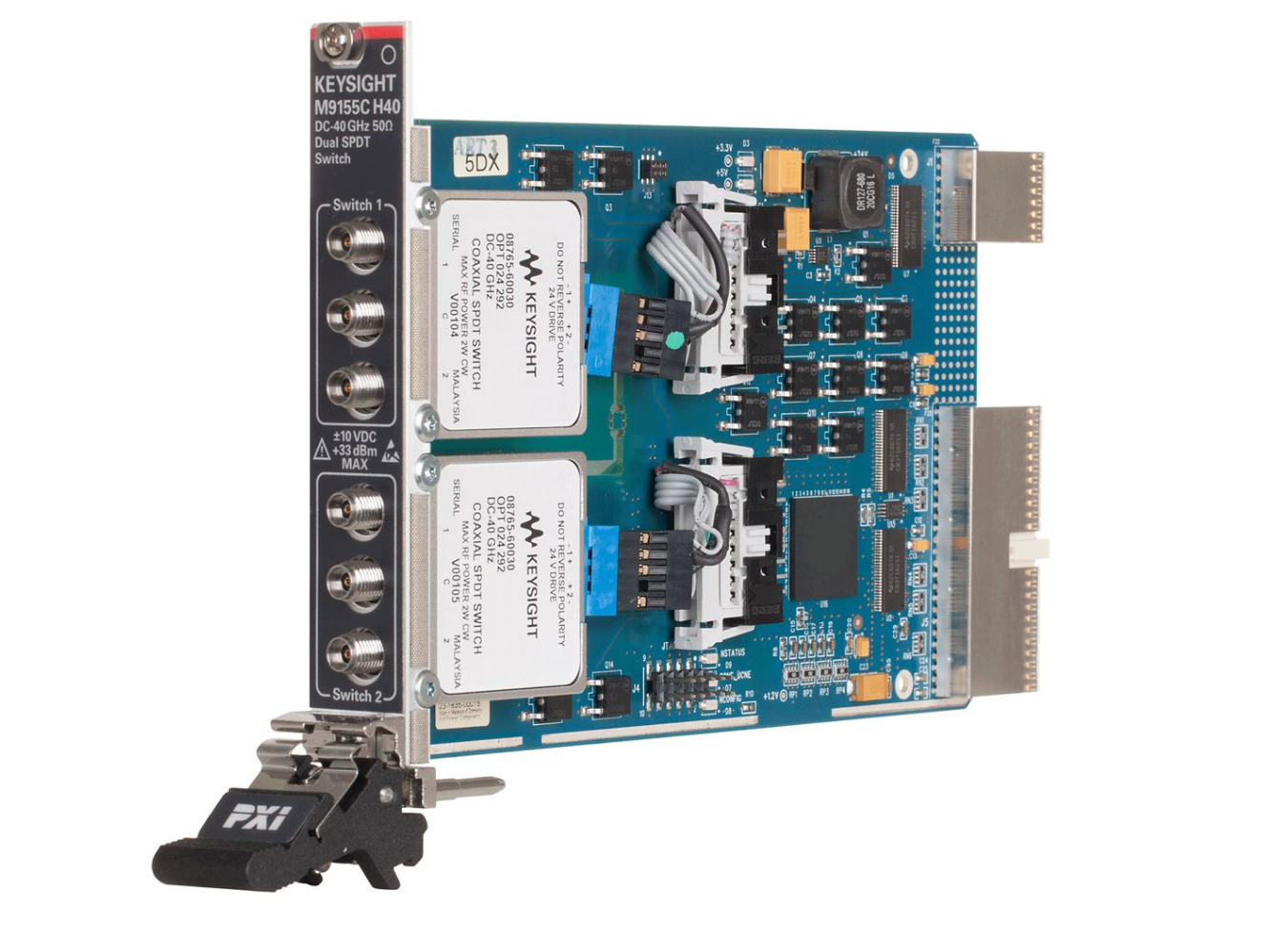 Keysight M9155CH40 是一款双路 SPDT PXI 混合开关模块,其中集成了两个 Keysight 8765D 同轴开关。 它占用一个插槽的宽度。